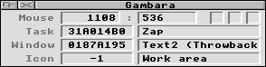 This is a simple tool for developers and provides feedback on the window elements under the pointer. Implemented in assembly for RiscOS3.1 I can't really remember anything about it except it does its job compactly and I think has quite a nice little interface.