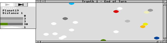 Multiplayer turn based space strategy game. Created initially as my project work for the Expert Systems course in university, it evolved into quite a comprehensive game give the limited mechanics of the game. Developed in BBC BASIC running under RiscOS. Over time I have used it as a test bed for playing around with some simple AI techniques for generating computer players. I also played around with Microsofts DirectX stuff by working on a realtime version of Trynth, with included an extended game mechanics.