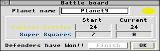 This window will pop up for any battles which involve at least one human player. You are informed of the planet which is being fought over, and the two sides involved. The initial owner of the planet is shown first, followed by the aggressor. The battle will then be automatically fought. If you wish to skip the intricacies select the Finish button. The result of the battle is described at the bottom of the window once it has finished. Click OK to continue.